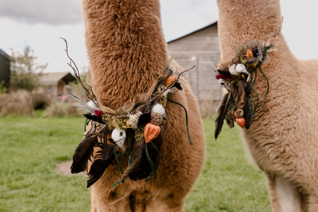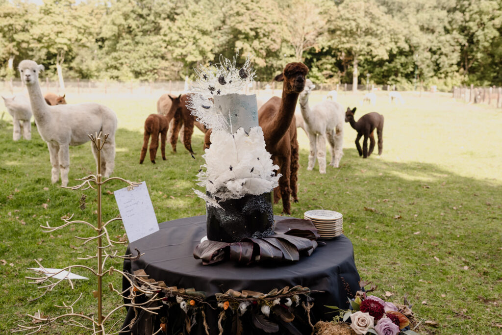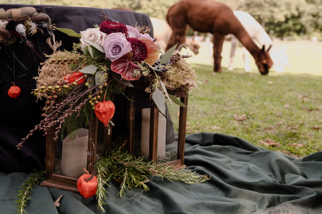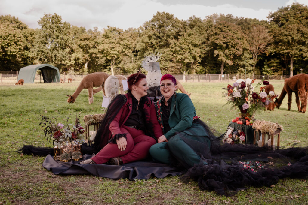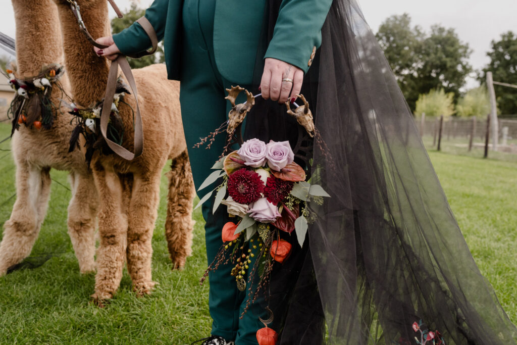 De styling was witchy, warm en persoonlijk: eigen pakken met zwarte sluiercapes, organische sieraden, handgemaakte details en een zachte, aardse sfeer. De alpaca’s en de knusse picknick gaven het geheel een speelse, bijna sprookjesachtige twist.