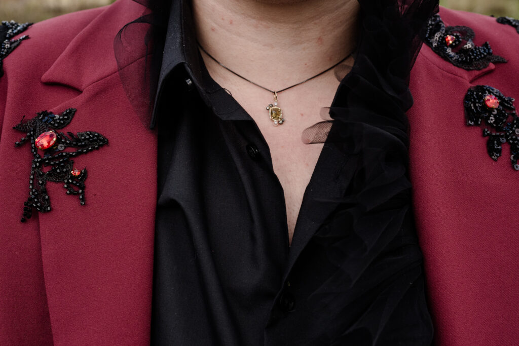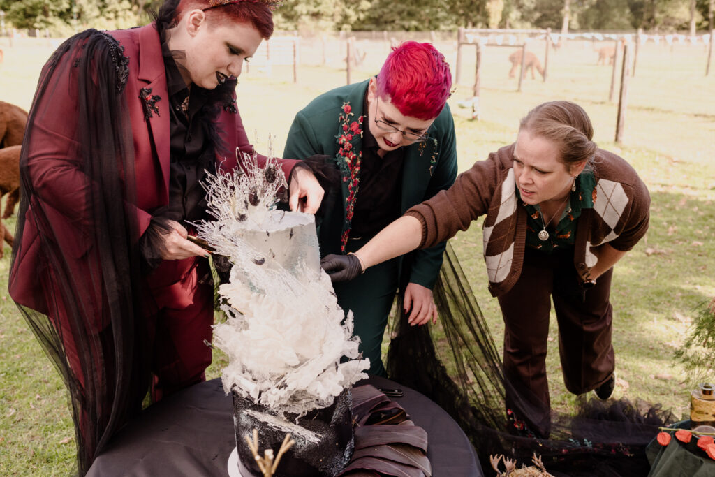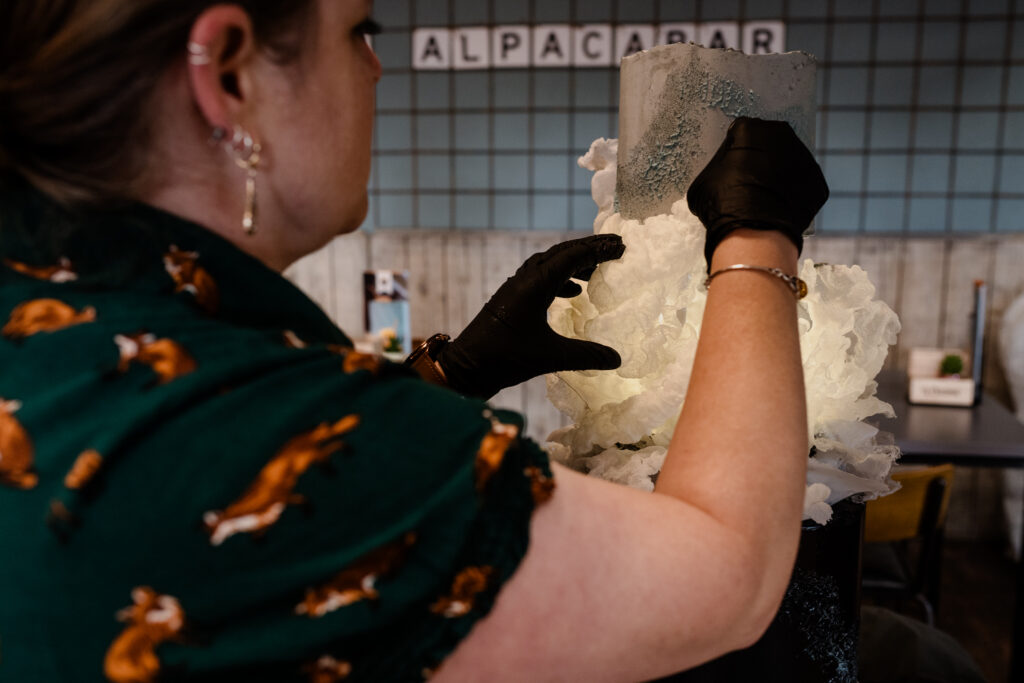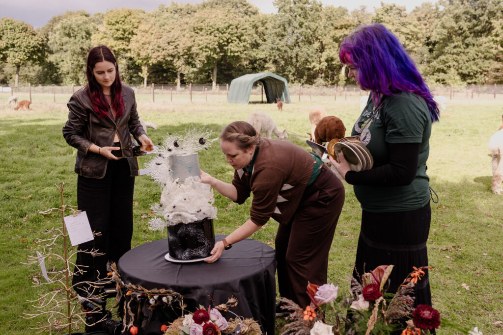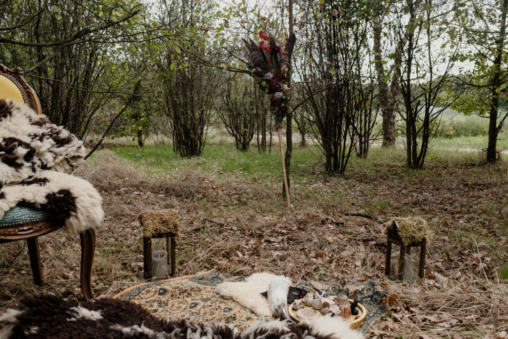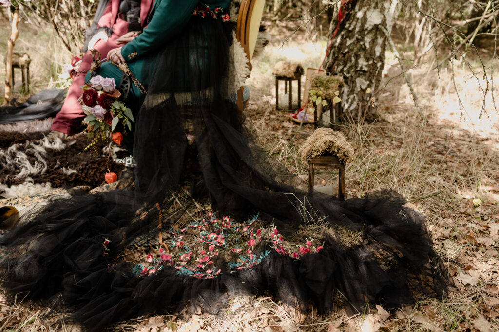 De styling was witchy, warm en persoonlijk: eigen pakken met zwarte sluiercapes, organische sieraden, handgemaakte details en een zachte, aardse sfeer. De alpaca’s en de knusse picknick gaven het geheel een speelse, bijna sprookjesachtige twist.